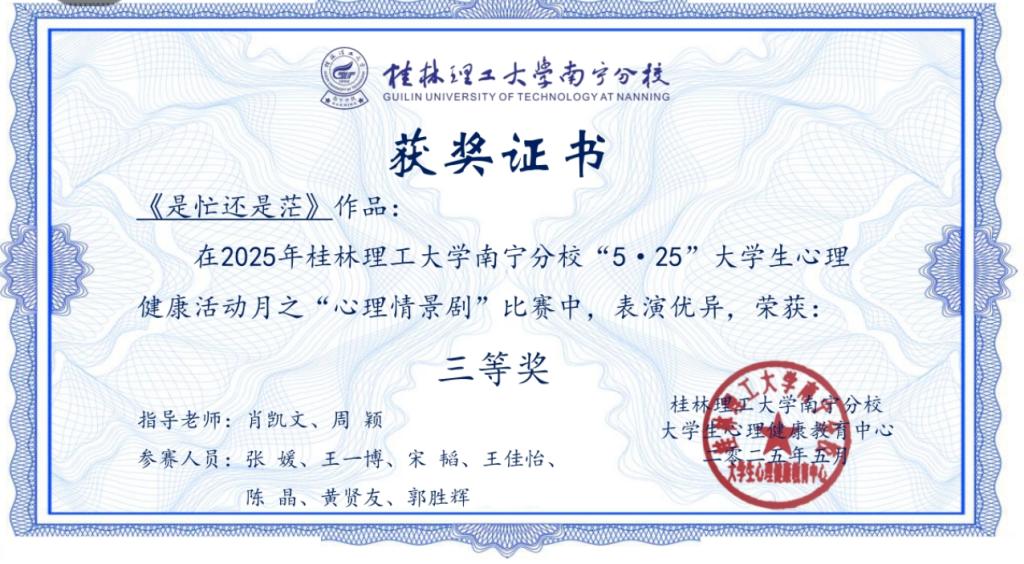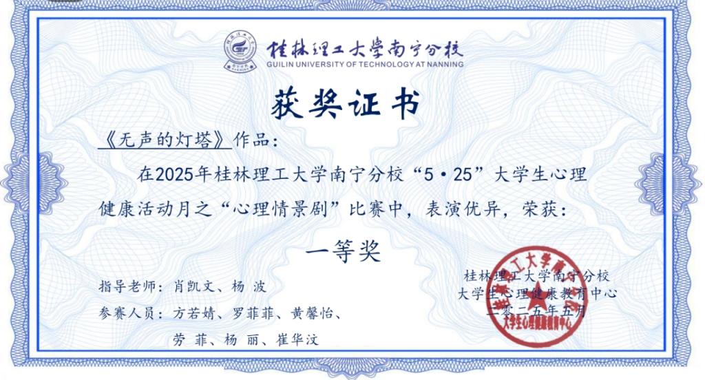 在活动月之“心理情景剧”比赛中,我院参赛学子热情投入,成绩突出,由冶金24-1班及冶金24-2班学生出演的作品《无声的灯塔》荣获比赛“一等奖”;由环境24-1班及环境24-2班学生出演的作品《是忙还是芒》荣获比赛“三等奖”;同时,冶金24-2班杨丽荣获心理情景剧比赛“最佳演员奖”荣誉称号。