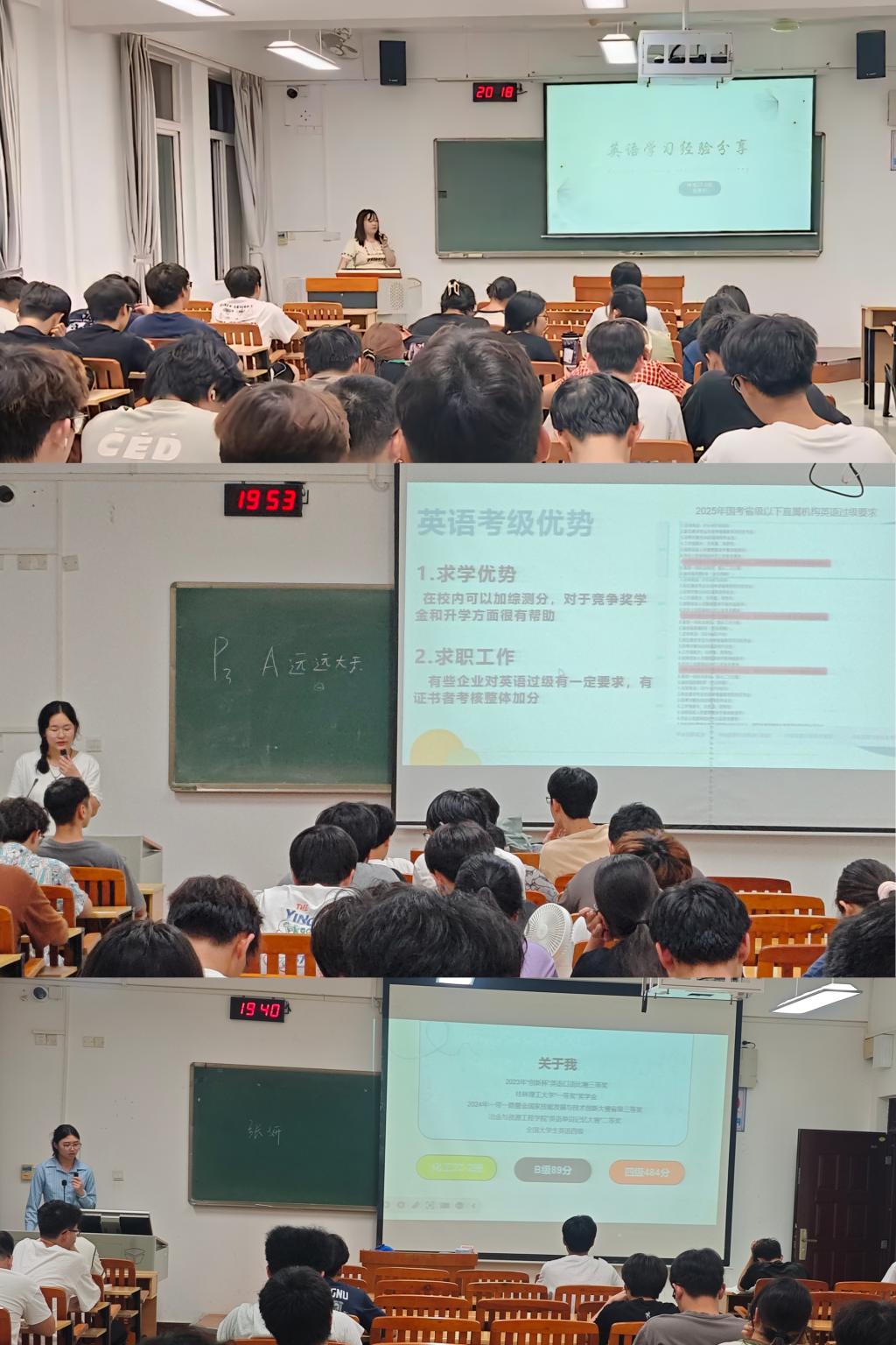 活动期间,学院共邀请了6位在英语等级考试中取得优异成绩的学生代表分享他们的备考经验和应试技巧,各位帮扶团成员从听力、阅读、写作和翻译等方面入手,详细介绍了他们的英语学习方法及考试技巧,并强调了英语学习对于大学生就业求职、考研等方面的重要性,并通过亲身经历鼓励同学们努力考取更好的成绩。