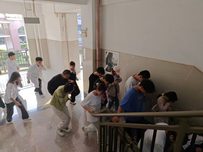宣讲教育结束后,以实验室同学们正在进行课堂实验过程中突发火情为场景,开展了火情场景应急处置演练。当火势较大,应急警报声响后,学生模拟准确迅速报警,老师们立即引导同学们有序疏散,大家用袖子捂住鼻子和嘴巴、弯腰迅速往楼下疏散……整个演练活动紧张而有序。