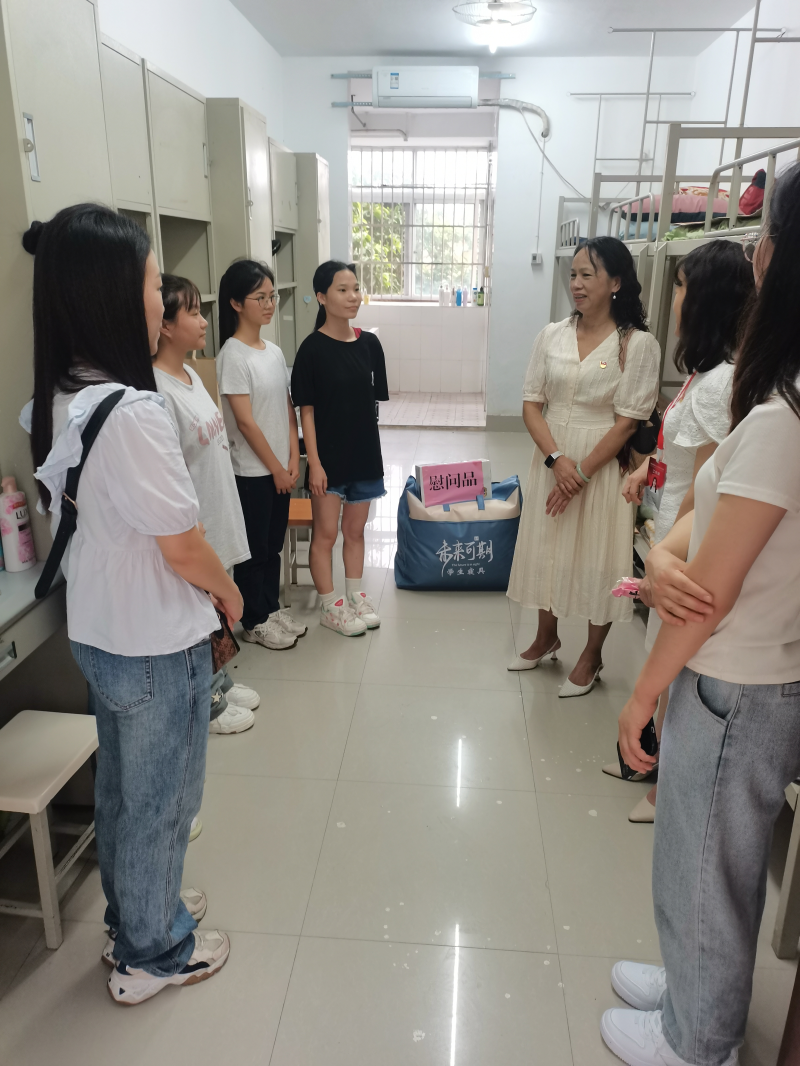 陈东莲副校长和肖彩霞副校长分别来到秀雅园4栋B座女生宿舍217和511以及周边宿舍,查看了新生宿舍水电及卫生等情况,同新生进行亲切交流、嘘寒问暖,给予了无微不至的关怀,并为新生代表送上慰问品,勉励新生和睦共处,共建情谊,好好学习,天天向上,提醒同学们强化安全意识,尤其是预防电信诈骗等。