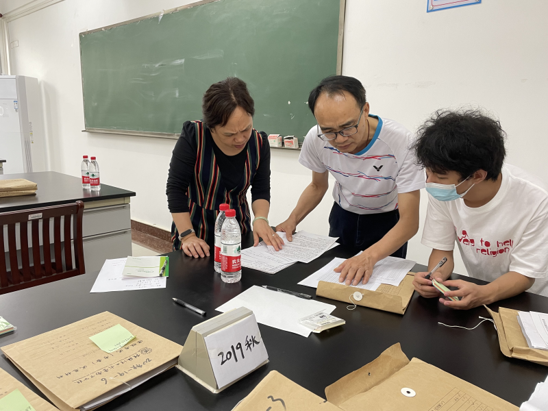 电气与电子工程系周红锴主任(中)认真检查教学材料,系主任何贵香(左)全程积极配合
