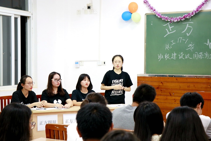 在辩论赛场上,双方辩手针对己方的辩题提出了相应的支撑观点,通过有利的证据去驳倒对方。其中自由辩论阶段最为精彩,在化工17-1班(正方)与应化17-2班(反方)的辩论中,正方从细节出发,询问对方辩友举行班级活动意在为何,反方由班级谈到国家层面,认为阶层领导更有利于建设国家,而在分析17-2班(正方)与环境17-2班(反方)的辩论中,正方抓住反方举出的清华大学的例子反攻反方,反方则顺势而下,强调正因为如今的学习环境,更应该抓住时间不断去学习,弥补差距。最终,此次半决赛,以化工17-1班与环境17-2班胜利晋级冠亚争夺战,应化17-2班与分析17-2班晋级季军争夺战而落下帷幕。