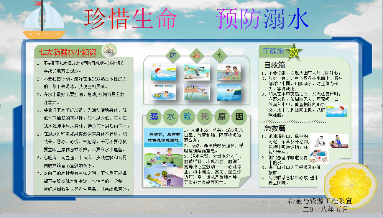5月21日-31日,我系各年级各班级根据工作安排,按照系部统一做好的防艾、防溺水安全教育内容,及时认真地召开防艾、防溺水安全主题班会,结合具体的实例,说明大学生防艾、防溺水的重要性,尤其强调了夏季高温容易发生溺水事故的危险性,并着重介绍了游泳相关防范措施和施救方法。各班同学在认真学习的基础上,签订了《冶金与资源工程系安全教育承诺书》和《太阳集团2138学生预防溺水告知书》,以此来警醒自己,敲响安全警钟。