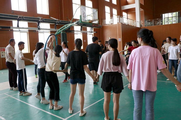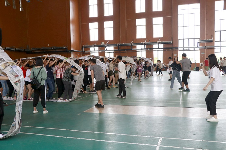 活动分为三个游戏,即分别是:1.穿越呼啦圈;2.有轨电车;3.无敌风火轮。在第一个在穿越呼啦圈游戏中,同学们手挽着手,相互配合,相互协调。在有轨电车活动中,同学们充满信心与斗志,口号声和助威声响彻整个体育馆,配合默契。如果说前两个活动是班级内小部分同学的“单打独斗”,那么无敌风火轮,就是整个班级的“全力出击”,在这个活动中,需要全班同学们一起配合用报纸制作一个可以容纳10个人,牢固不易破的“风火轮”,同学们积极配合,相互帮助,共同前进。