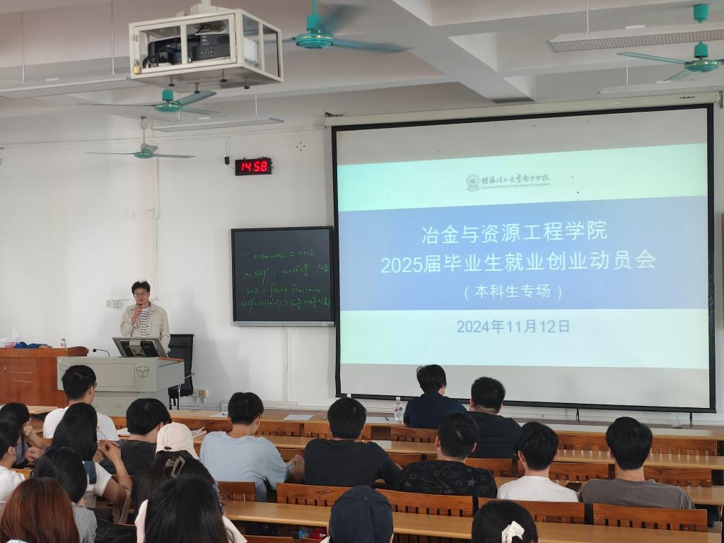 学院党委书记韦国才老师为2025届本科生作就业动员讲话。强调到,一是要认清就业形势,坚定就业信心。尽管宏观层面就业形势十分严峻,但我院资源循环科学与工程专业的就业前景还是相对较好,近几届毕业生就业去向落实率均达90%以上。要求同学们正视形势困难的同时更要坚定信心,做到务实、理性求职;二是要明确就业目标,放平就业心态。要求同学们要明确个人求职目标,不好高骛远,要脚踏实地,先稳就业,再择业。三是要抢抓就业机会,积极主动就业。要求同学们要抢抓10月-12月的黄金求职时间,珍惜来校招聘的每一家用人单位的就业岗位,积极参加各种宣讲招聘会,早日实现就业。