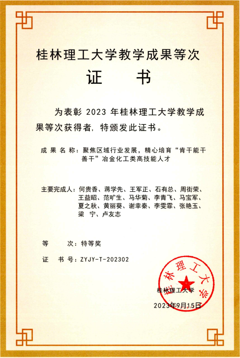 专业建设效果显著。近年来,获校级A类专业建设项目6项、校级B类专业建设项目5项、本科专业分级建设项目3项。《聚焦区域行业发展,精心培育“肯干能干善干”冶金化工类高技能人才-成果应用证明材料》获得学校教学成果奖特等奖。